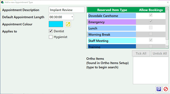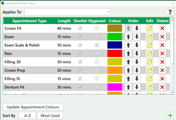 Enter the description, length and select the edit icon to select a colour. The appointment can also be set for a Dentist, Hygienist or both. Preventing incorrect appointment types being booked with the wrong staff member.