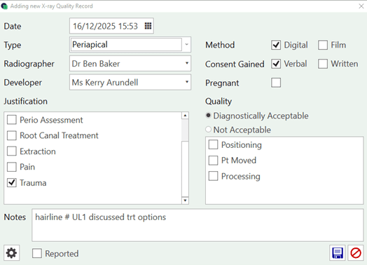 You can now record your X-Ray QA details in Pearl, allowing this to be reported on and used for CQC inspections. Access the X-ray details through the Radiograph symbol.