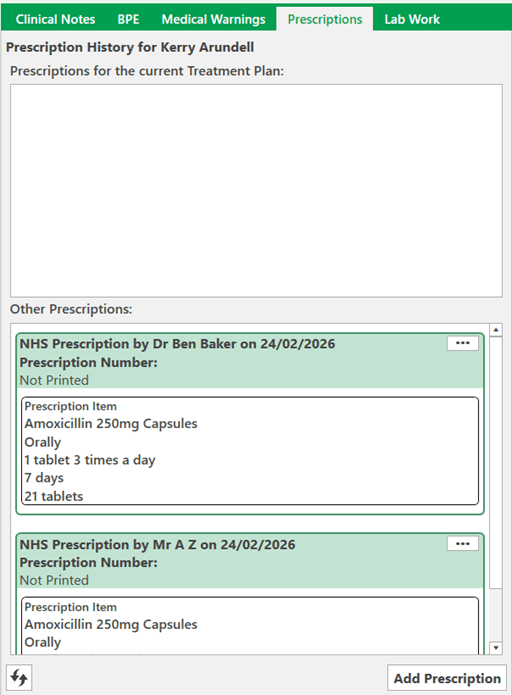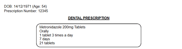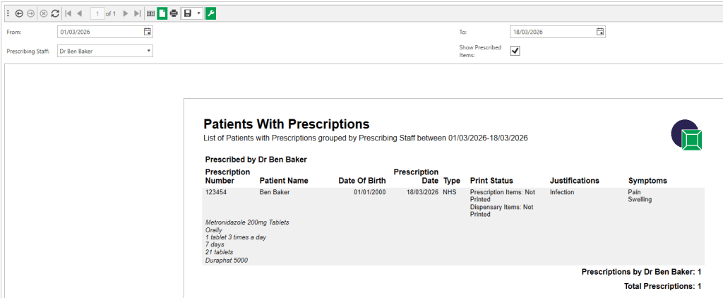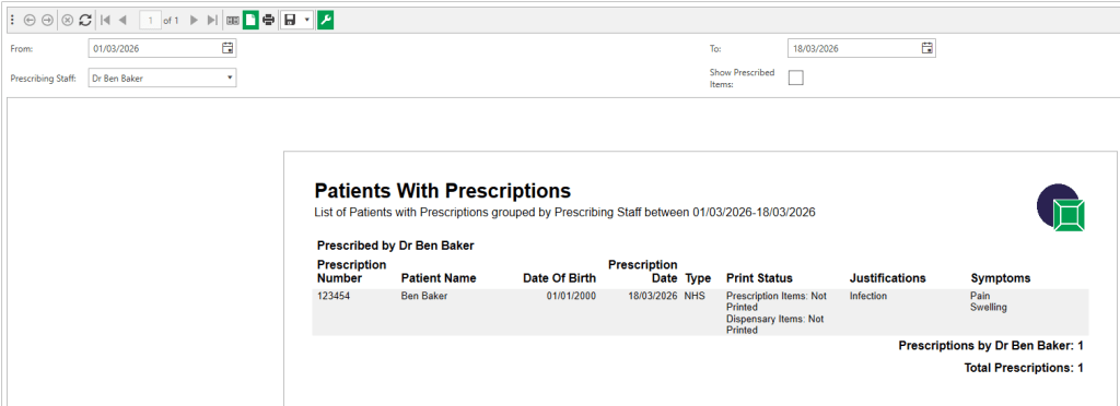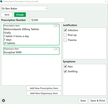 Once the prescription has been added select the Prescriber, Justification, Symptoms and Prescription number (for NHS practices).